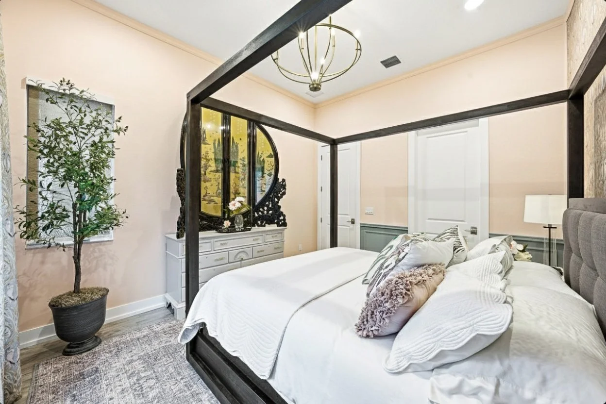 Art Deco herons take flight across the wall behind the bed and are echoed in the custom draperies, their graceful forms adding movement and a touch of glamour that echoes the golden age of design. The subtle blush tones enveloping the walls provide the warm embrace that transforms a bedroom into a sanctuary—soft enough to soothe, sophisticated enough to enchant.